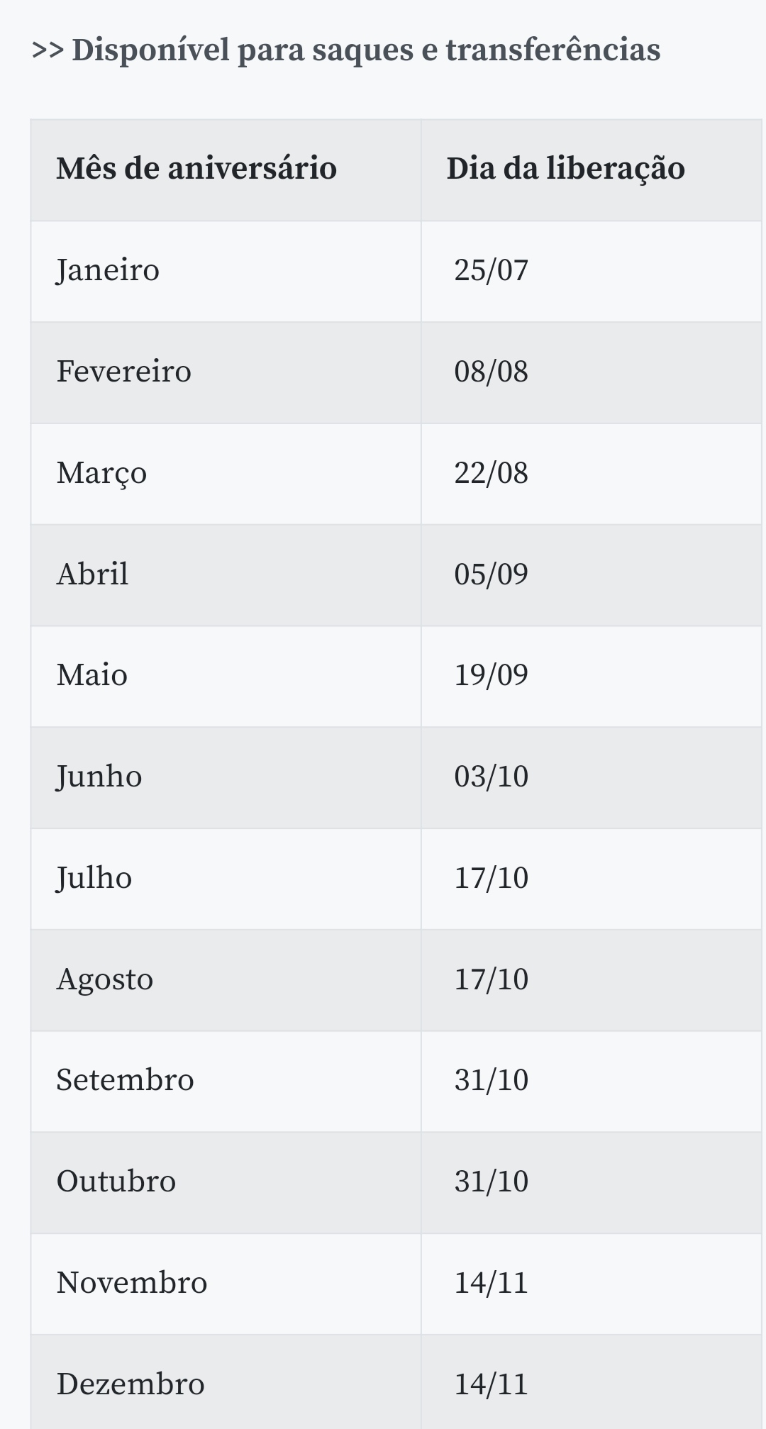 O processo envolverá dois calendários: um de crédito em conta e outro de saque. O primeiro procedimento será realizado semanalmente, às segundas-feiras, começando no dia 29 de junho e indo até 21 de setembro. A exceção será o dia 8 de setembro, terça-feira, em função do feriado da independência.