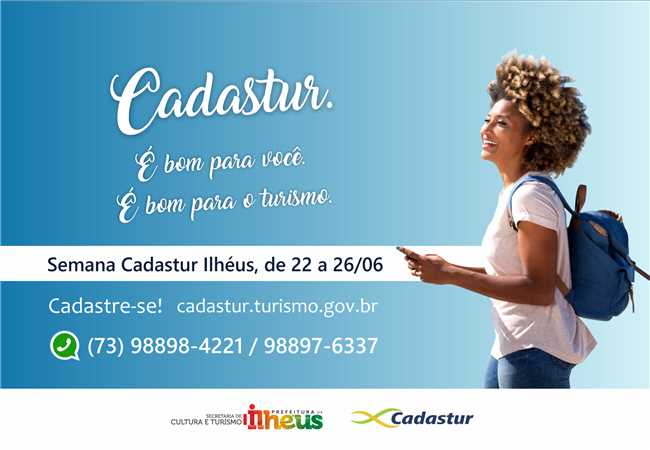 Com o lançamento da Semana Cadastur, a Secretaria Municipal de Cultura e Turismo (Secult) da Prefeitura de Ilhéus convoca pessoas físicas e jurídicas que atuam no setor do turismo para realizar o cadastro, gratuito e válido por dois anos, por meio da plataforma do Ministério do Turismo https://cadastur.turismo.gov.br/. A campanha, que segue até o mês de agosto, é realizada em três edições. Nesta primeira semana, a Secult oferece suporte virtual pelo Whats App através dos números (73) 98898-4221 e 98897-6337, de 22 a 26 de junho das 14h às 18h.