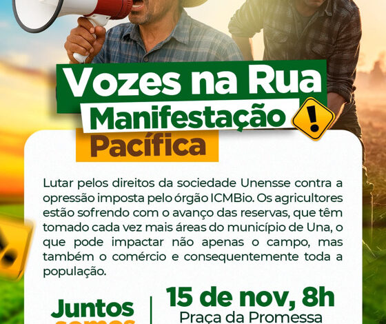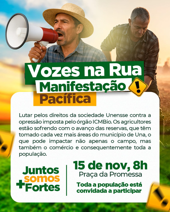 A comunidade rural de Una realizará no próximo sábado, 15 de novembro, uma grande manifestação em resposta à forma de atuação do ICMBio e ao avanço das unidades de conservação no município. Agricultores afirmam que as medidas vêm impondo restrições excessivas, dificultando o trabalho no campo e prejudicando o desenvolvimento econômico local.